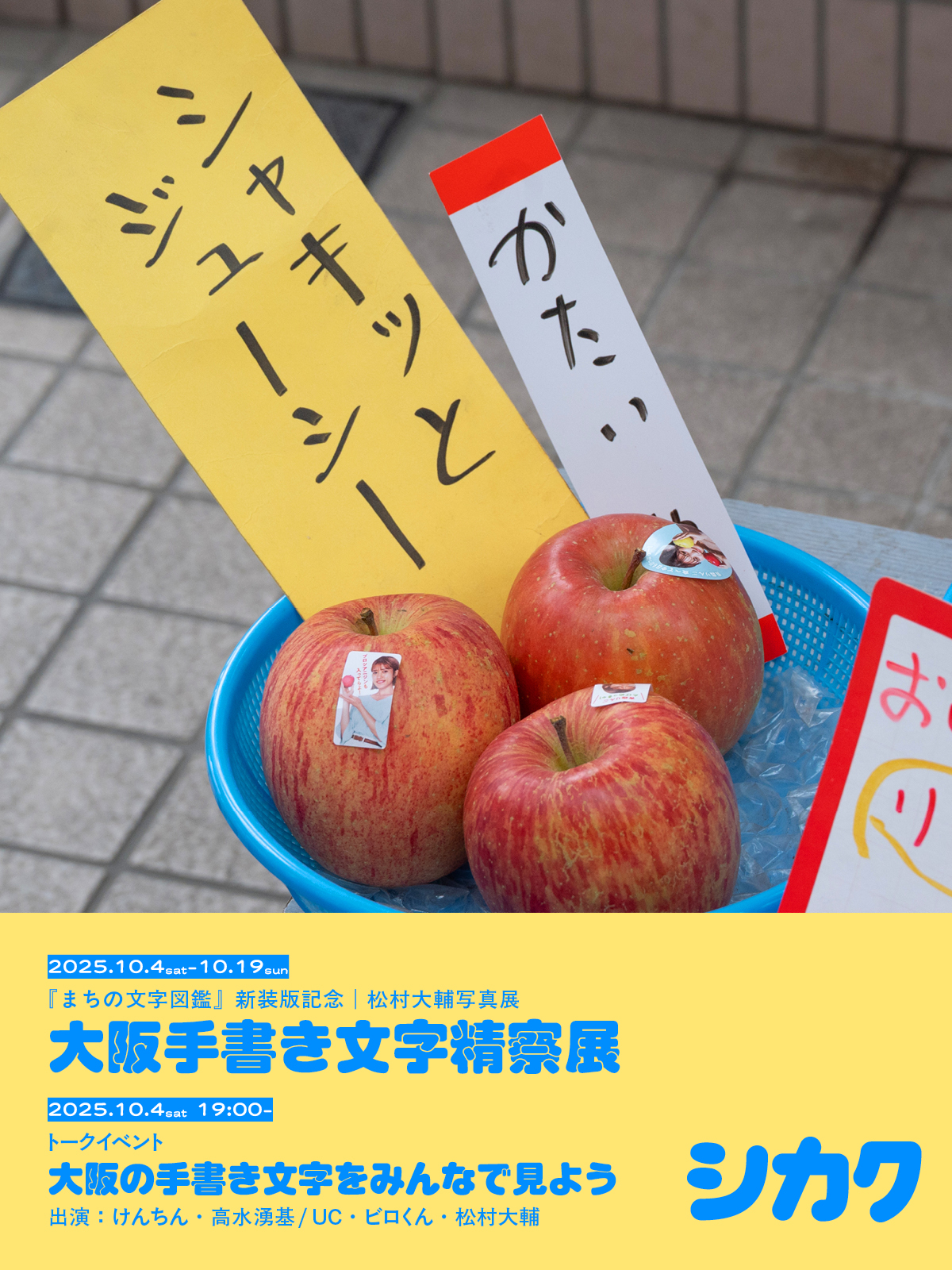 大福書林『まちの文字図鑑』シリーズ新装版を記念して、松村大輔・写真展「大阪手書き文字精察展」を開催します。大阪の各地で出会った、気持ちのこもった商品POPやちょっぴり怖い注意書きなど、商人の町大阪ならではの「人の心に訴える手書き文字」をご堪能ください。