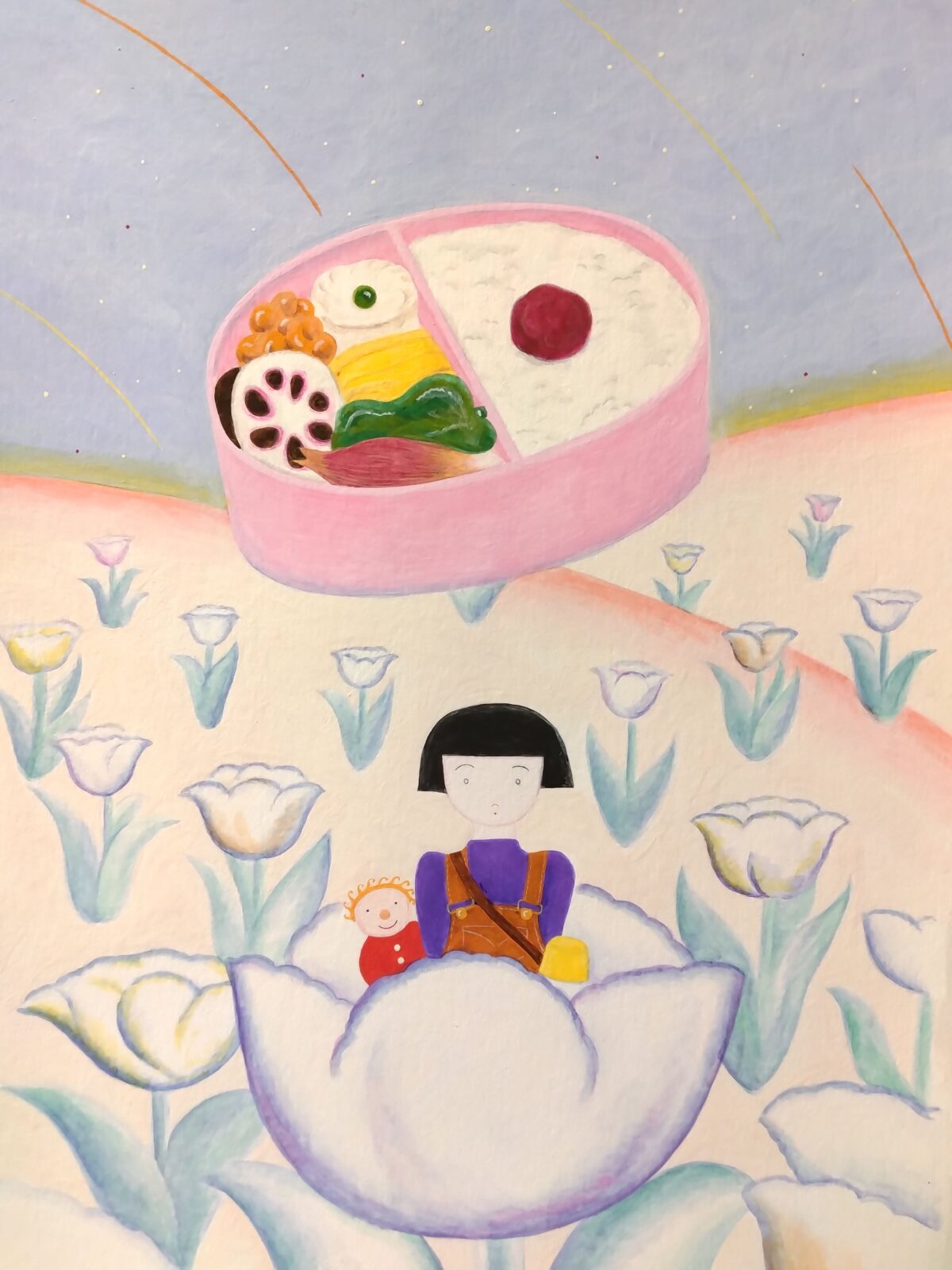 冬毛の先生原画+描き下ろし春の絵「先生のおべんとう」